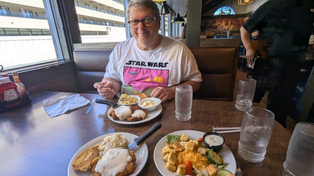It opened at 3pm. It was 12:30. We went back three buildings and went to Denny’s. I ordered the 55+ country fried steak with so so so good mashed potatoes and a very good salad. Keith had fried chicken and gravy. It was so air conditioned and our waiter just kept bringing glorious glasses of water filled with ice.